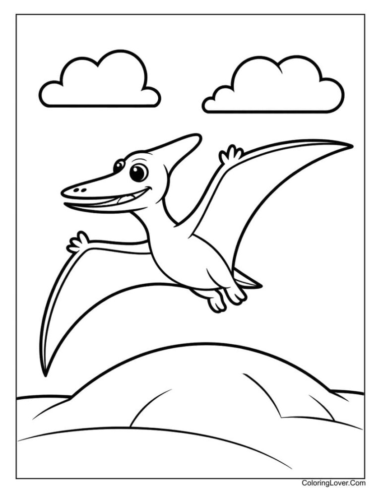 A flying dinosaur soars high between clouds in this joyful image. One of the best printable dinosaur coloring pages!