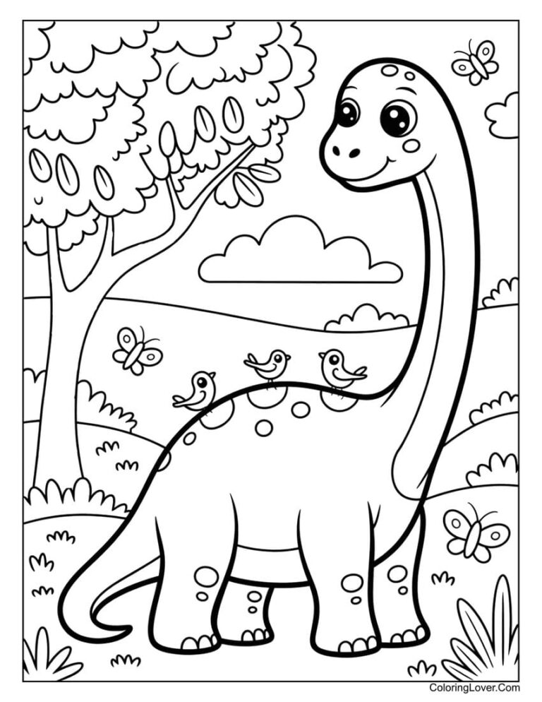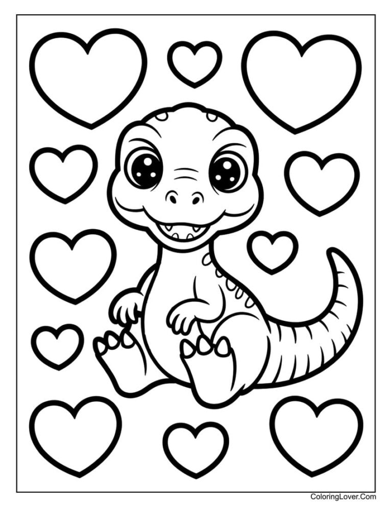 Surrounded by hearts, this smiling dinosaur radiates love. Great for preschool kids learning through play and color.