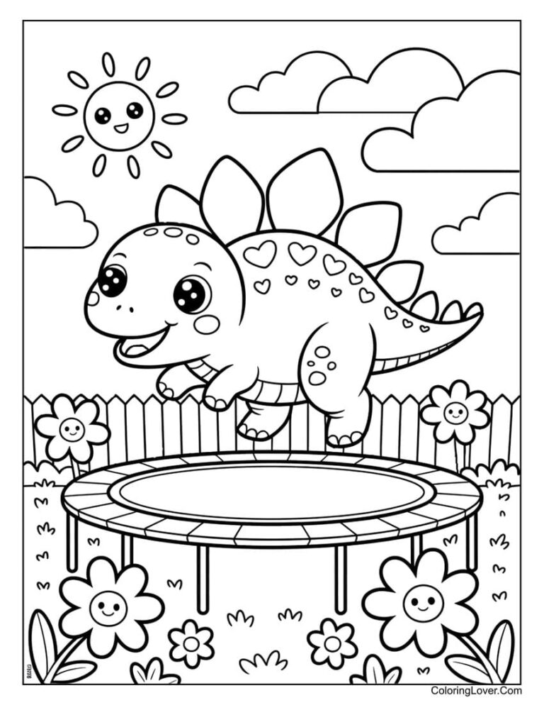 A spiky little stegosaurus bounces happily on a trampoline in a garden. Flowers, sunshine, and fun all around!