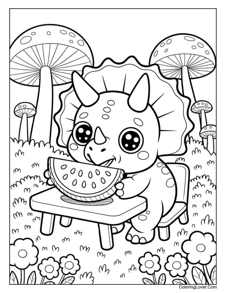A cute triceratops enjoys juicy watermelon at a tiny picnic table. Surrounded by mushrooms, it’s snack time in dino land!