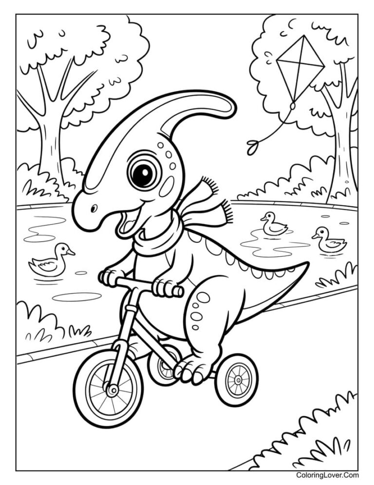 This playful parasaurolophus rides a bike by the lake on a breezy afternoon. A perfect mix of dino fun and outdoor joy..