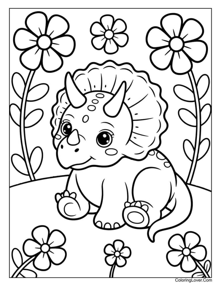 This cute dinosaur sits among daisies in a sweet garden. Easy shapes and lines make it a gentle start for beginners.